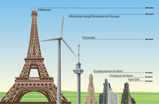 Hebt u al geprobeerd uit te rekenen vanaf welke afstand u een windmolen van 240 meter hoogte kunt zien? En met welke gebouwen is dat te vergelijken in Nederland?
